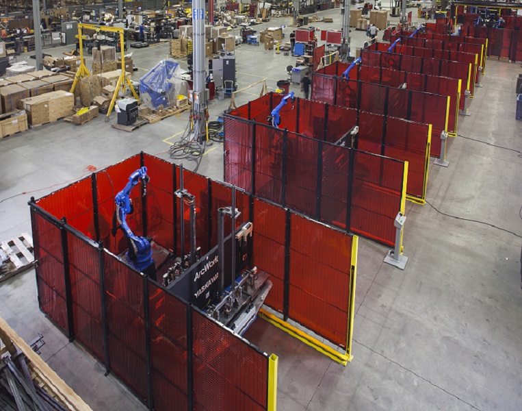 Robotic cells are basically boxes where the robot is stored on the production floor. You can see that this robot cell has special walls to protect workers from the intense light that welding causes!