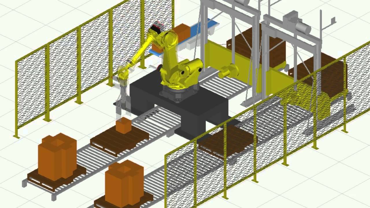 In these programming software packages, you can also put up all of the fences and even the actual products that you will be working with, such as this pick and place robot moving around boxes that are on a conveyer belt.
